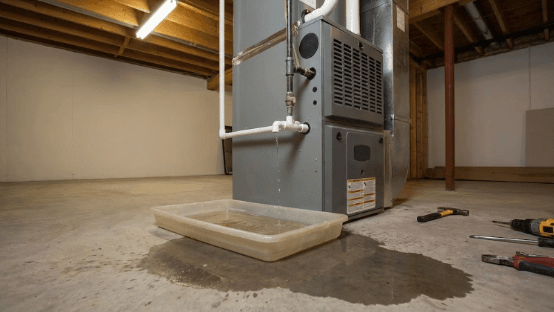 A furnace can leak water due to condensation backup, a clogged condensate drain, a damaged drain line, or a malfunctioning condensate pump. Other causes include a cracked heat exchanger, a faulty humidifier, or issues with the exhaust pipe. It’s best to first check and clean the condensate drain, but if the problem continues, contact a professional HVAC technician for a full diagnosis.